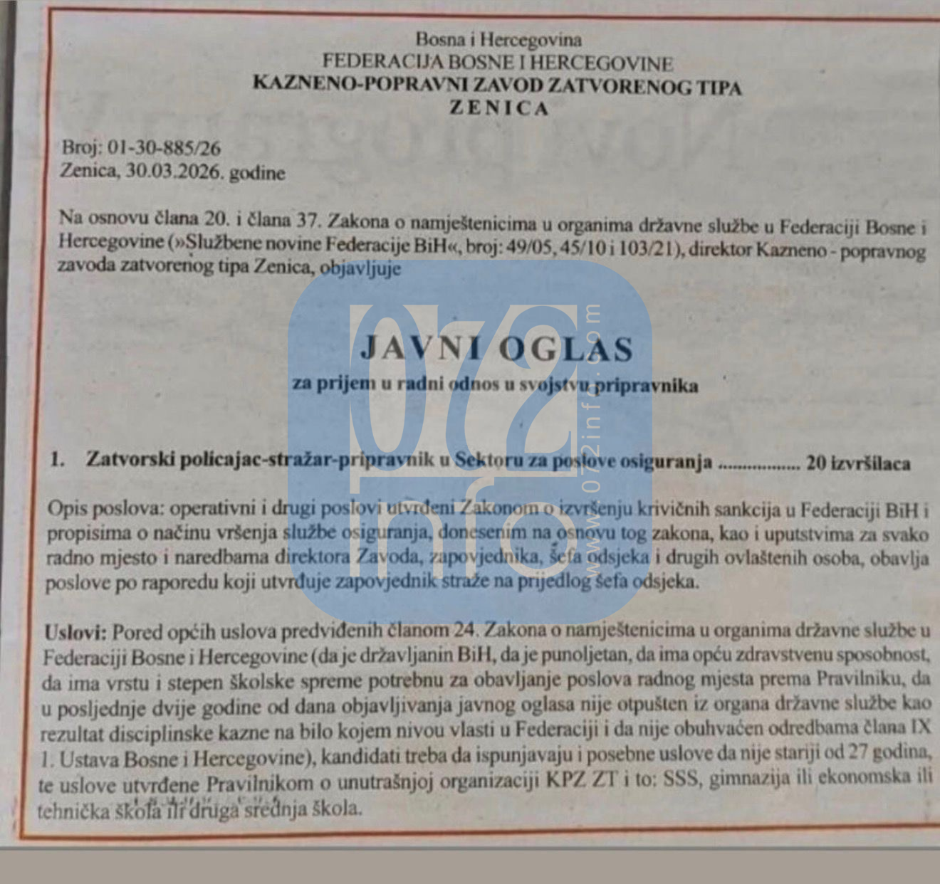 Oglas je objavljen na osnovu Zakona o namještenicima u organima državne službe u Federaciji BiH, a potpisuje ga direktor KPZ Zenica. Kako je navedeno, izabrani kandidati obavljat će operativne i druge poslove u skladu sa zakonskim propisima, pravilnicima i internim aktima ustanove, uz rad prema rasporedu koji utvrđuje zapovjednik straže.
