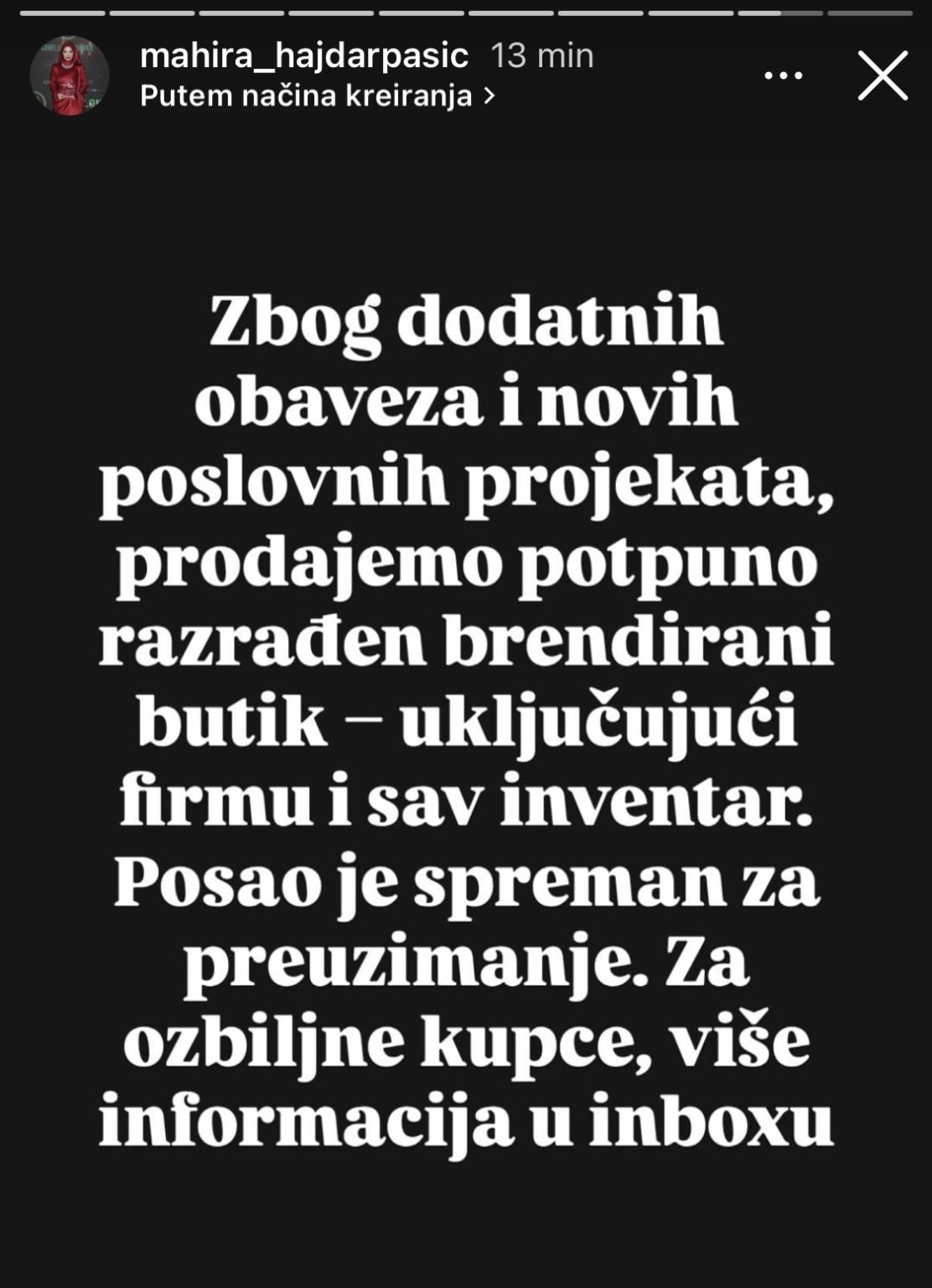 – Zbog dodatnih obaveza i novih poslovnih projekata, prodajemo potpuno razrađen brendirani butik – uključujući firmu i sav inventar. Posao je spreman za preuzimanje. Za ozbiljne kupce, više informacija u inboxu – poručila je.