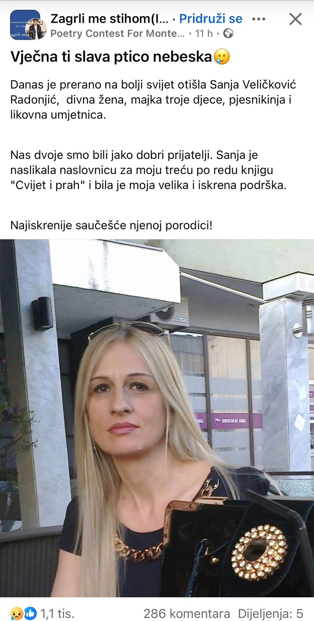 Na bolji svijet preselila je Sanja Veličković Radonjić – plemenita i nadarena žena, majka troje djece, pjesnikinja, likovna umjetnica i glumica, čije je ime bilo utkano u brojne kulturne događaje i pozorišne scene.