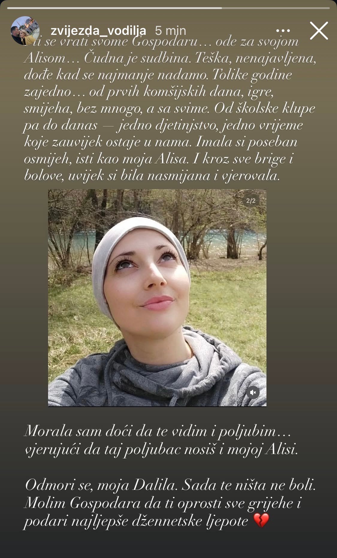 Posebno dirljivu poruku uputila je Melisa Kustura, sestra rahmetli Alise Kusture, koja je također izgubila životnu bitku s karcinomom. U svojoj objavi prisjetila se zajedničkih trenutaka, djetinjstva i dugogodišnjeg prijateljstva, ističući koliko je Dalila bila posebna i uvijek nasmijana uprkos teškim životnim iskušenjima.