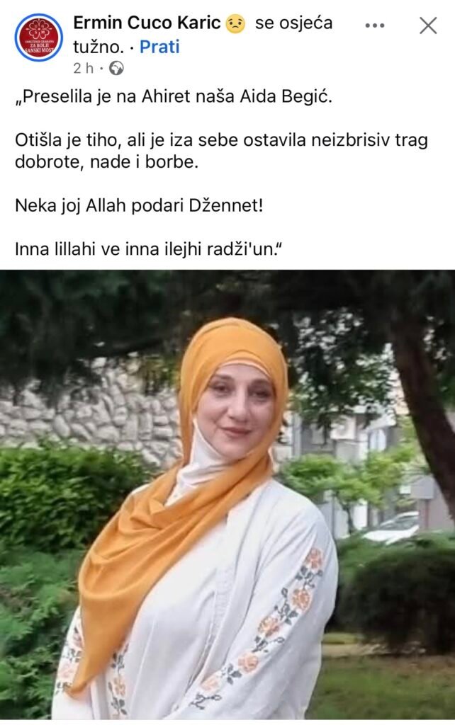 „Otišla je tiho, ali je iza sebe ostavila neizbrisiv trag dobrote, nade i borbe. Neka joj Allah podari Džennet. Inna lillahi ve inna ilejhi radži’un“, stoji u objavi.Screenshot