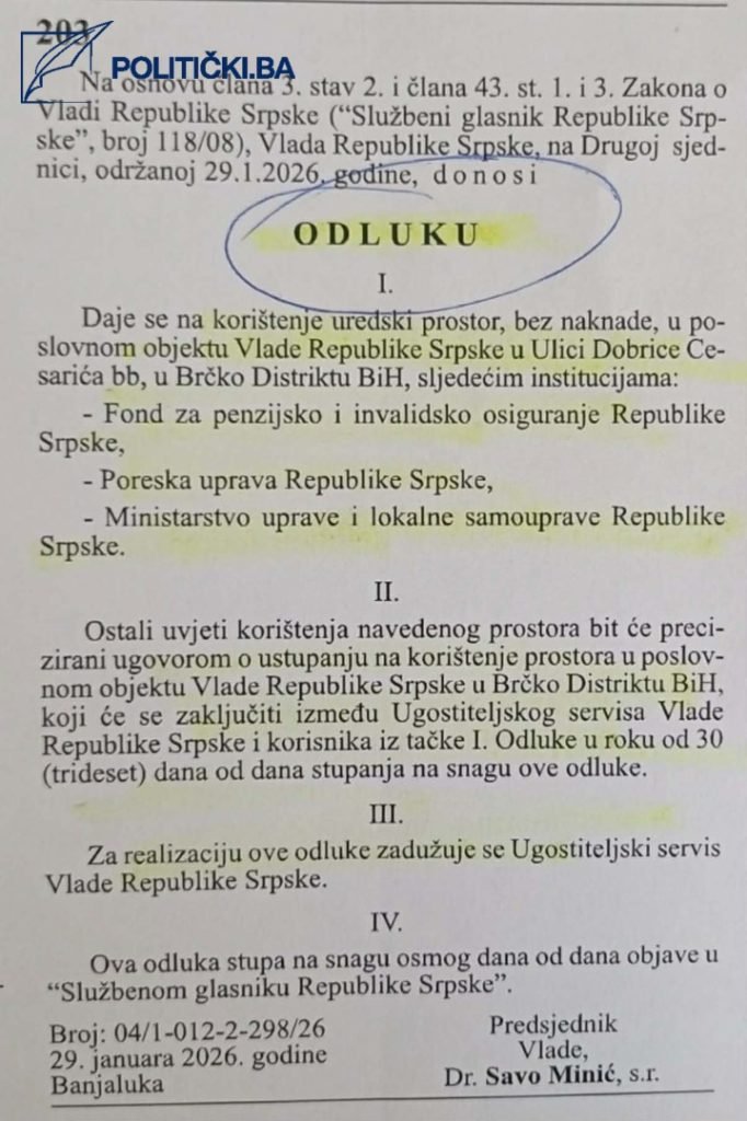 Vlada entiteta Rs odlučila je u Brčko Distriktu otvoriti svoje urede za penzijsko-invalidsko osiguranje, poreze, ali i kancelariju Ministarstva uprave i lokalne samouprave tog entiteta, javlja Politicki.ba.