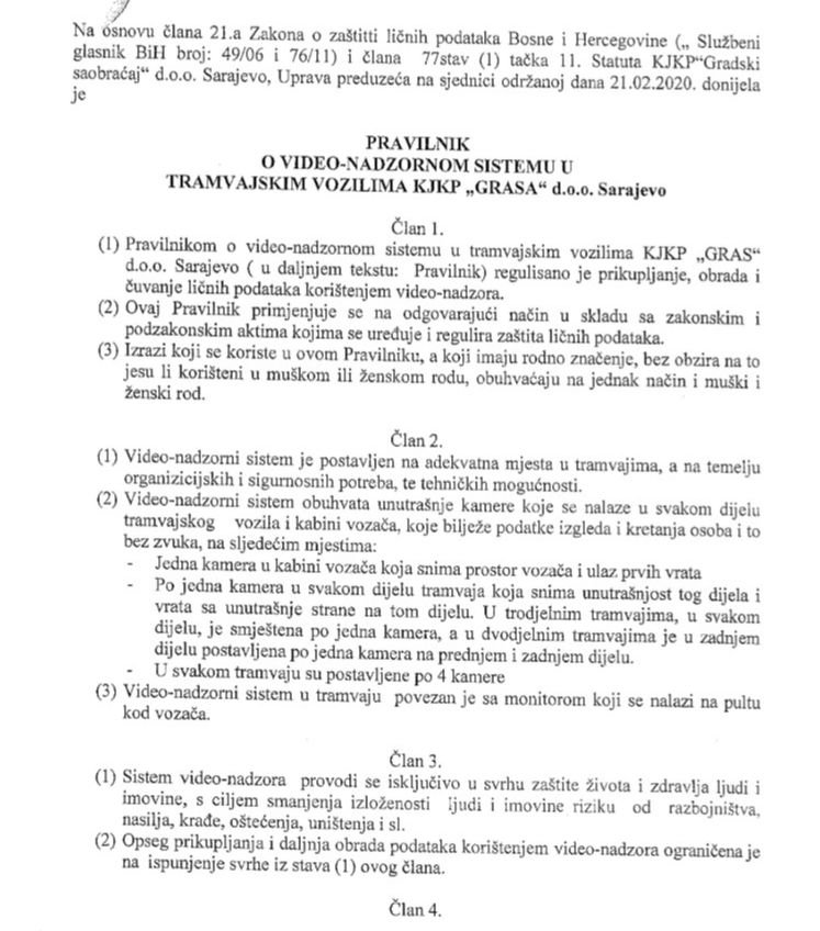 Prema Pravilniku o video-nadzornom sistemu u tramvajskim vozilima GRAS-a, “video-nadzorni sistem obuhvata unutrašnje kamere koje se nalaze u svakom dijelu tramvajskog vozila i kabini vozača, koje bilježe podatke izgleda i kretanja osoba i to bez zvuka”.