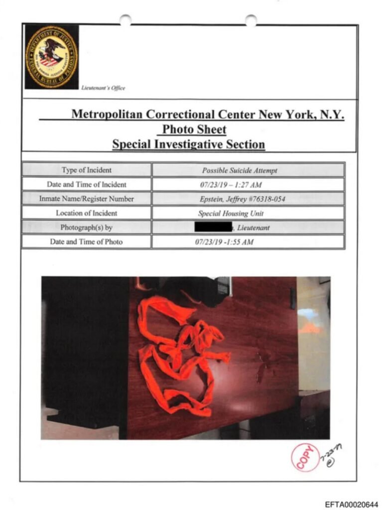 Fotografije prikazuju Epstajna na leđima, na nosilima ili podlozi, sa vidljivim povredama vrata i lica. Upravo ove fotografije su deo interne dokumentacije kojom se beleži stanje zatvorenika nakon incidenta;