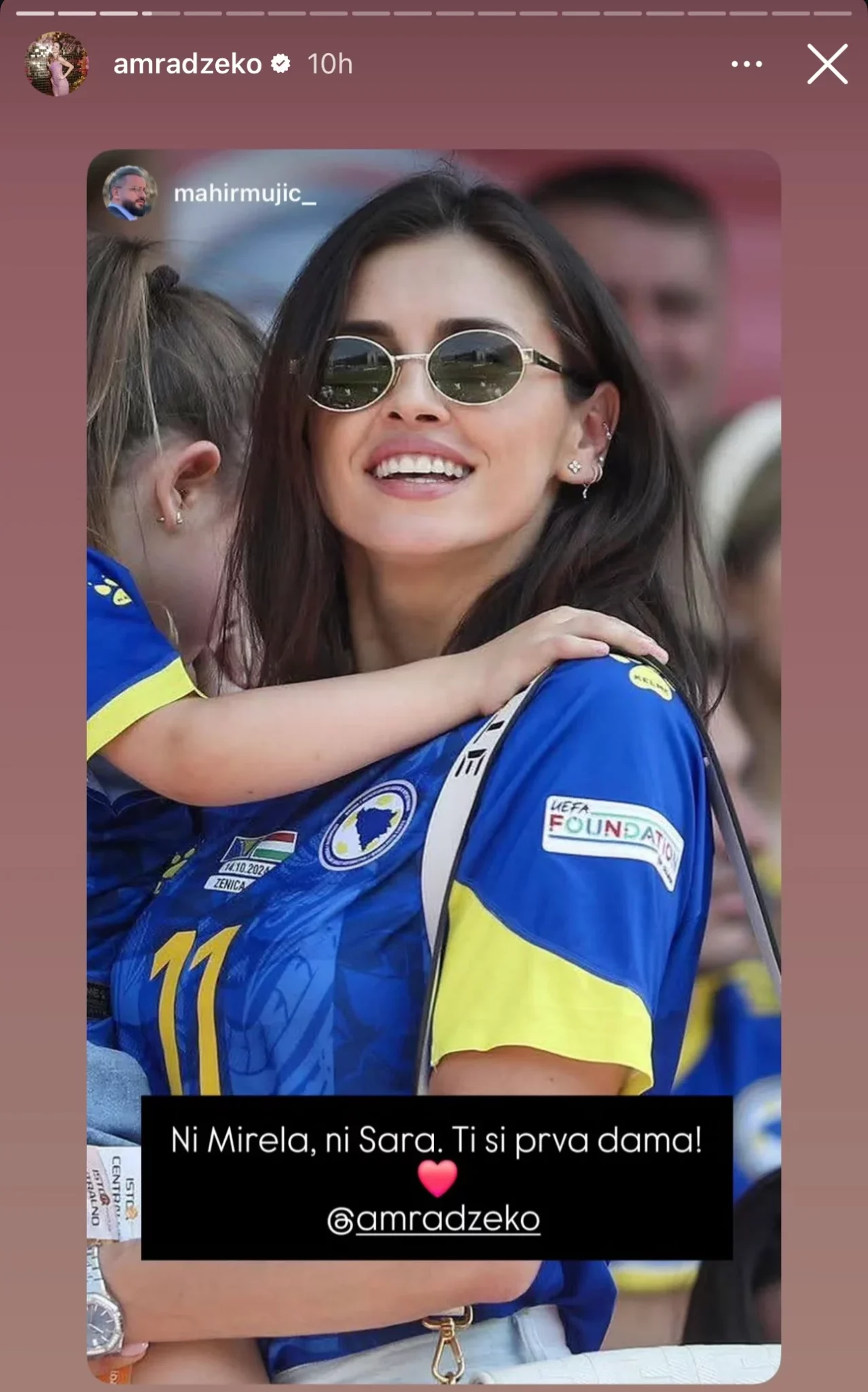 Na društvenim mrežama korisnici su je zasuli porukama podrške i oduševljenja, a jedna rečenica koja joj je upućena posebno se izdvojila i nju je i Amra Džeko podijelila na svom Instagram storyju: “Ni Mirela, ni Sara – ti si prva dama”.