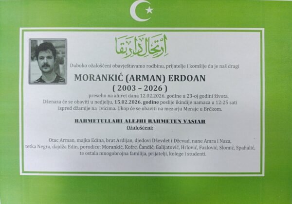 Tragično stradalom Morankiću će se dženaza klanjati sutra, 15. februara, poslije ikindije namaza u 12:25 sati ispred džamije na Ivicima. Ukop će se obaviti na mezarju Meraje u Brčkom.