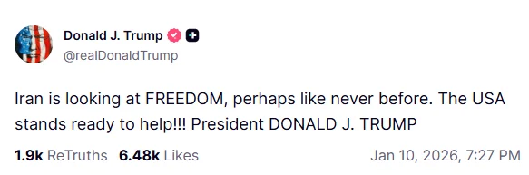 Američki predsjednik Donald Trump komentarisao je antirežimske proteste širom Irana na svom nalogu na mreži Truth Social, prilikom čega je istaknuo podršku Sjedinjenih Američkih Država.